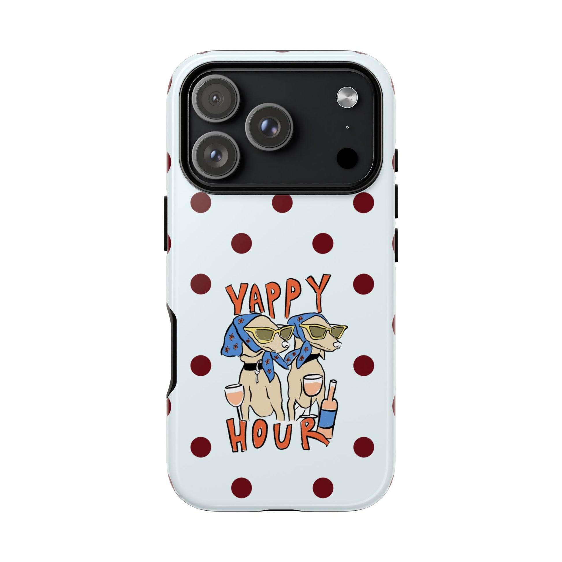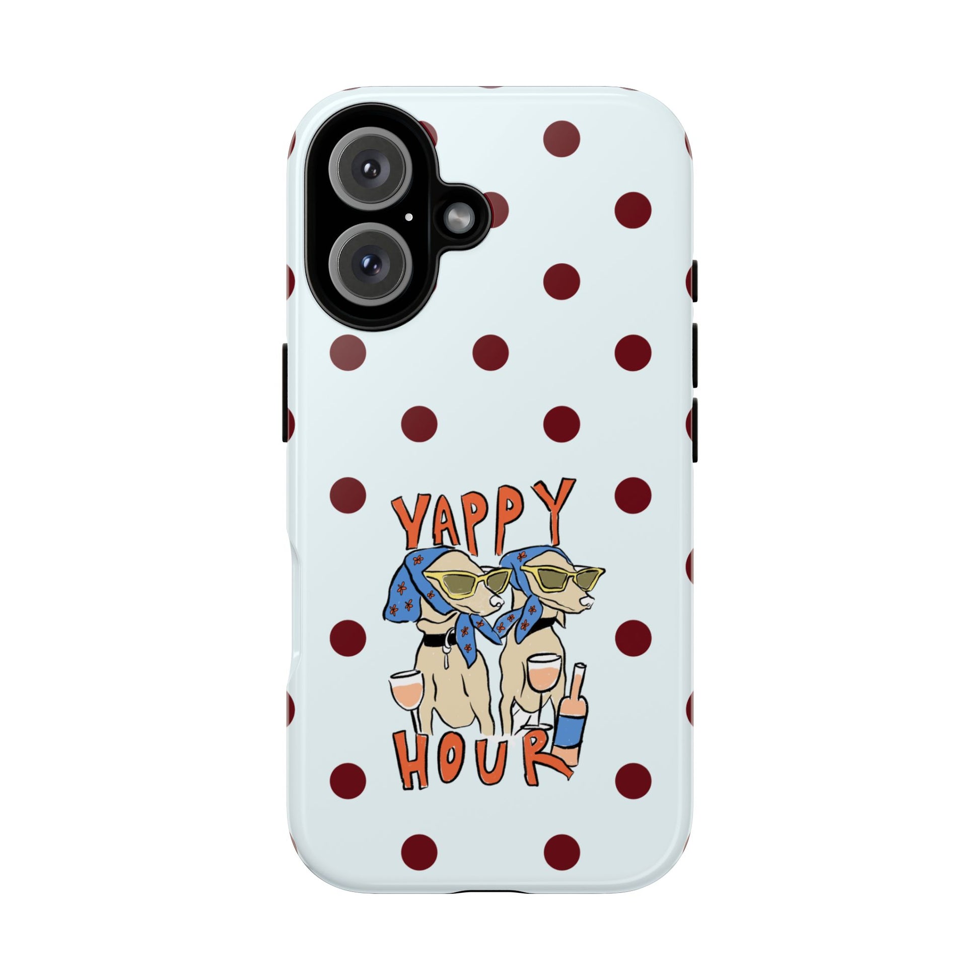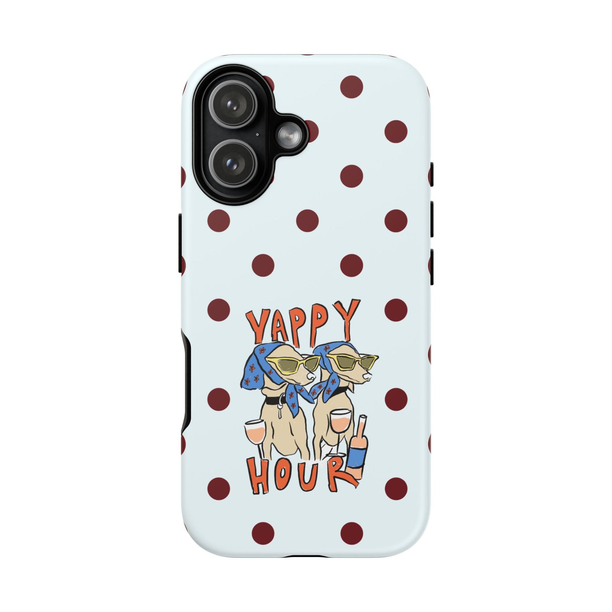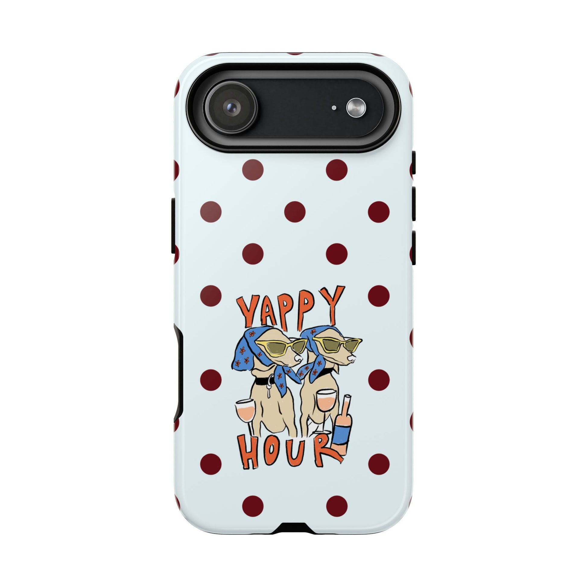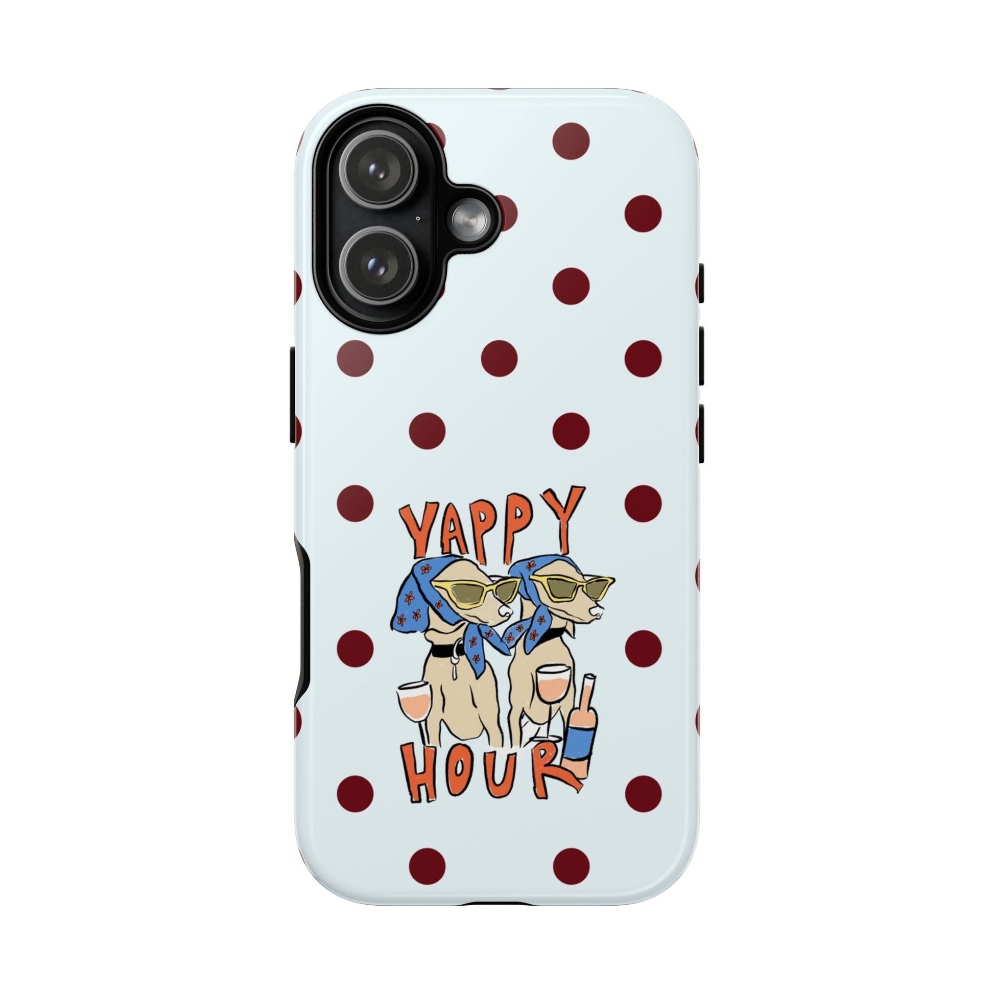Laughing pups, clinking glasses, and playful polka dots—this phone case brings a little happy hour wherever you go. The illustration captures dogs lounging with wine glasses, barking gossip and cozy summer energy. For adults who love cheeky, whimsical designs and reliable protection, this case balances personality with punchy durability.