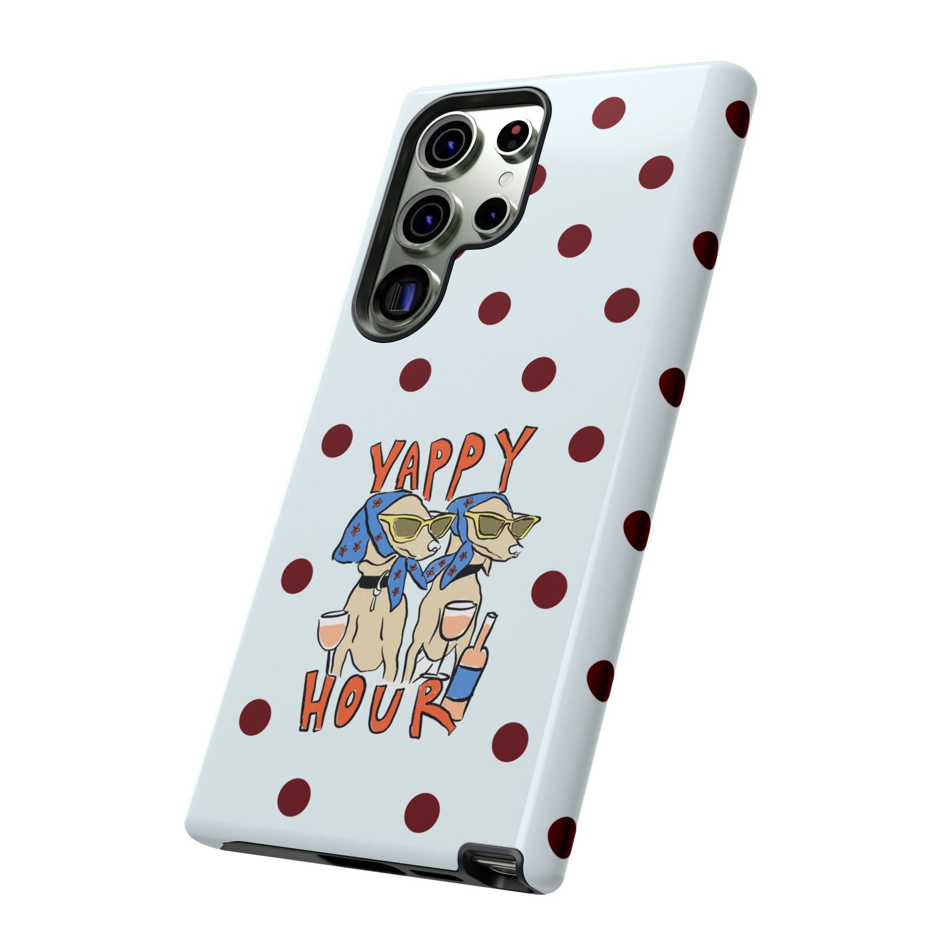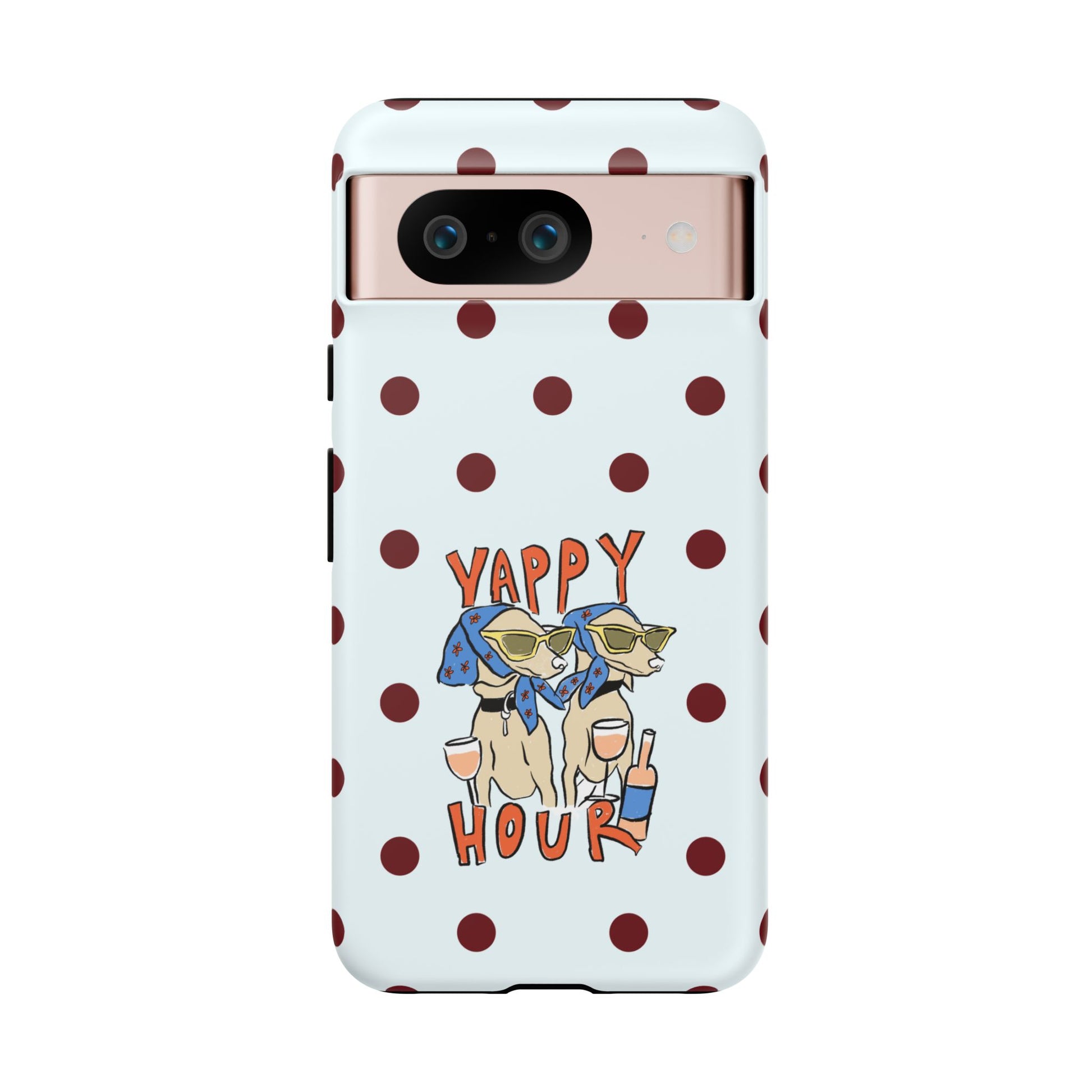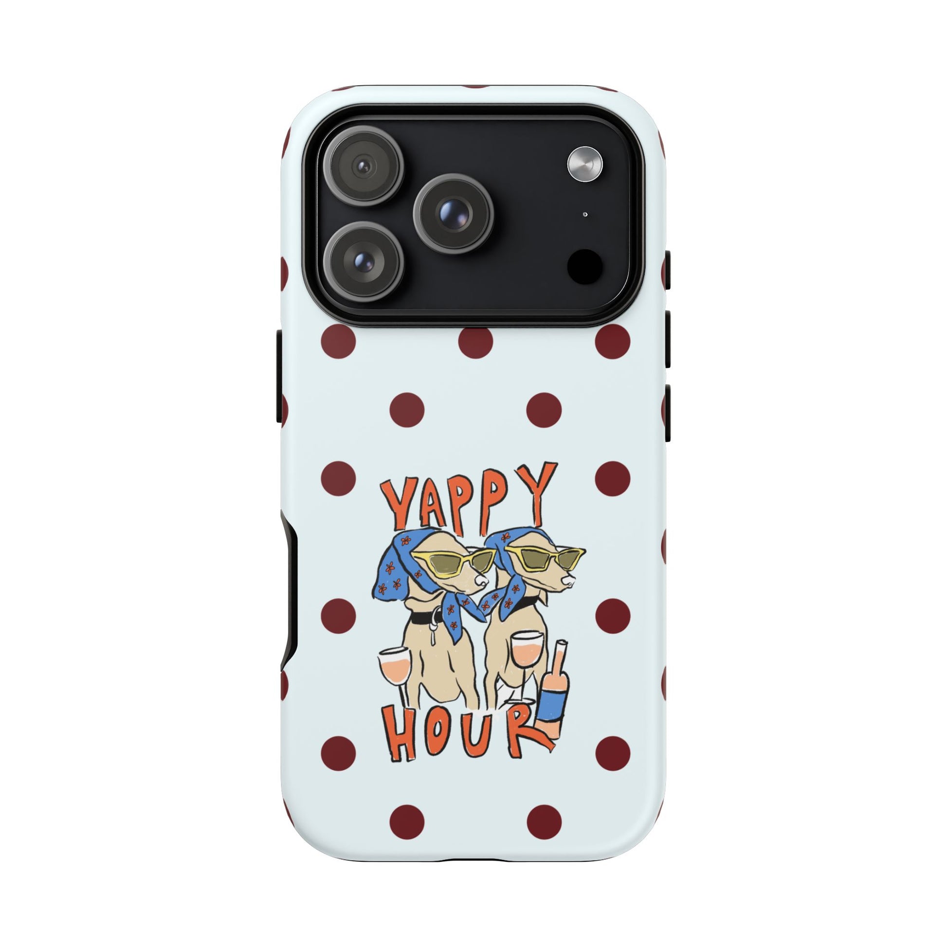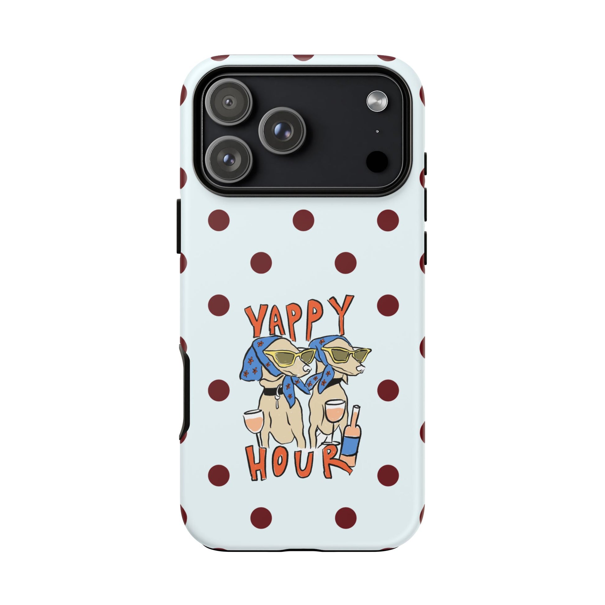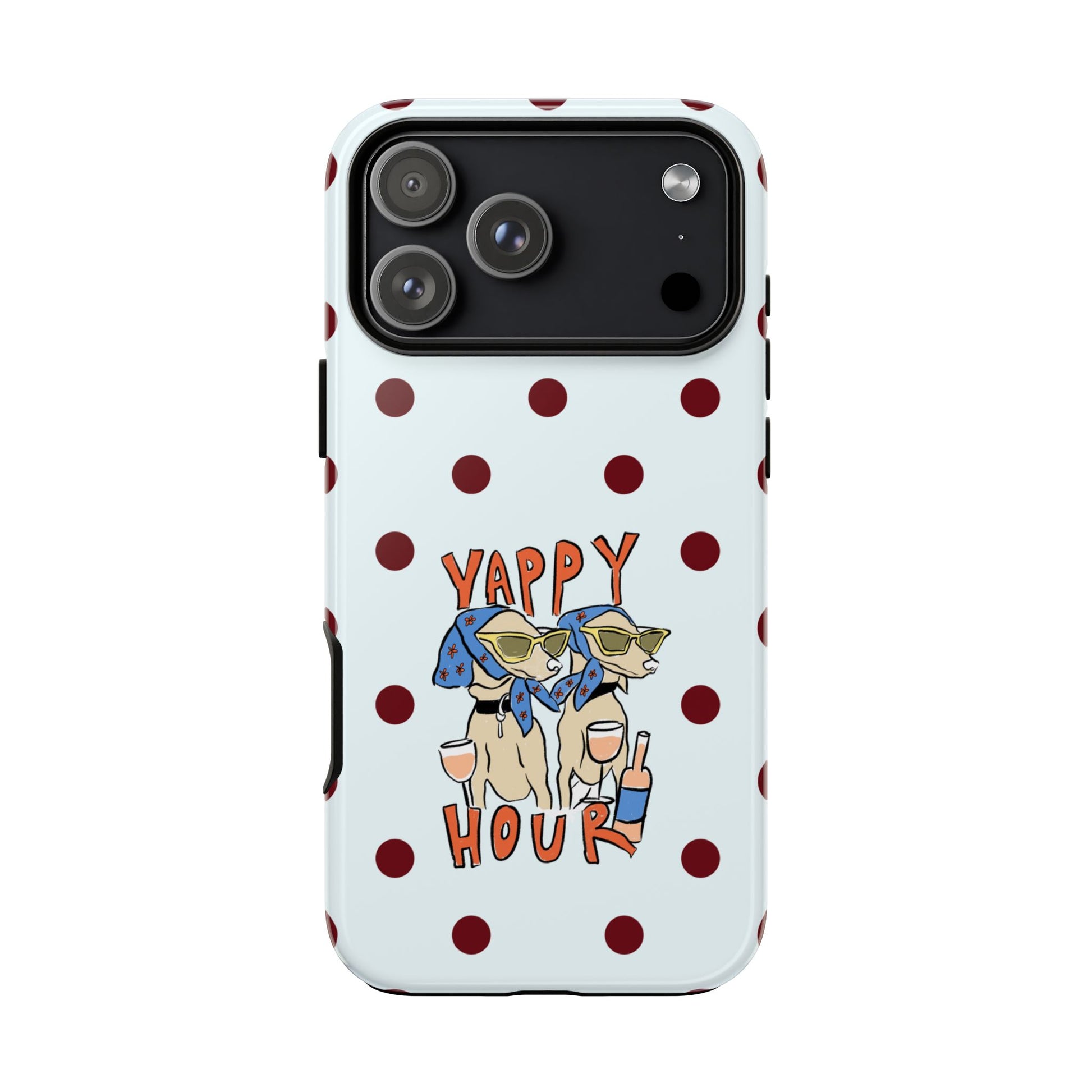 Laughing pups, clinking glasses, and playful polka dots—this phone case brings a little happy hour wherever you go. The illustration captures dogs lounging with wine glasses, barking gossip and cozy summer energy. For adults who love cheeky, whimsical designs and reliable protection, this case balances personality with punchy durability.