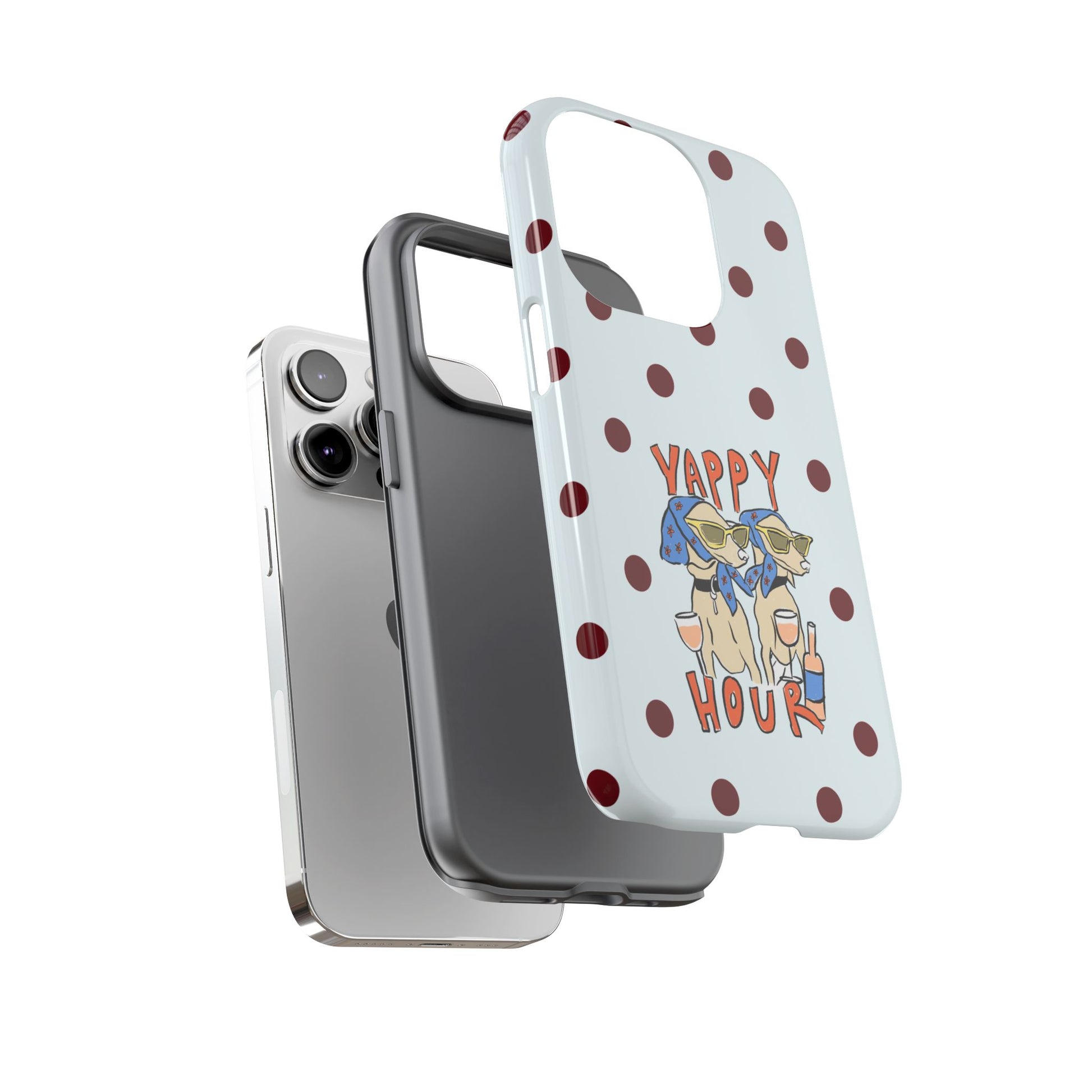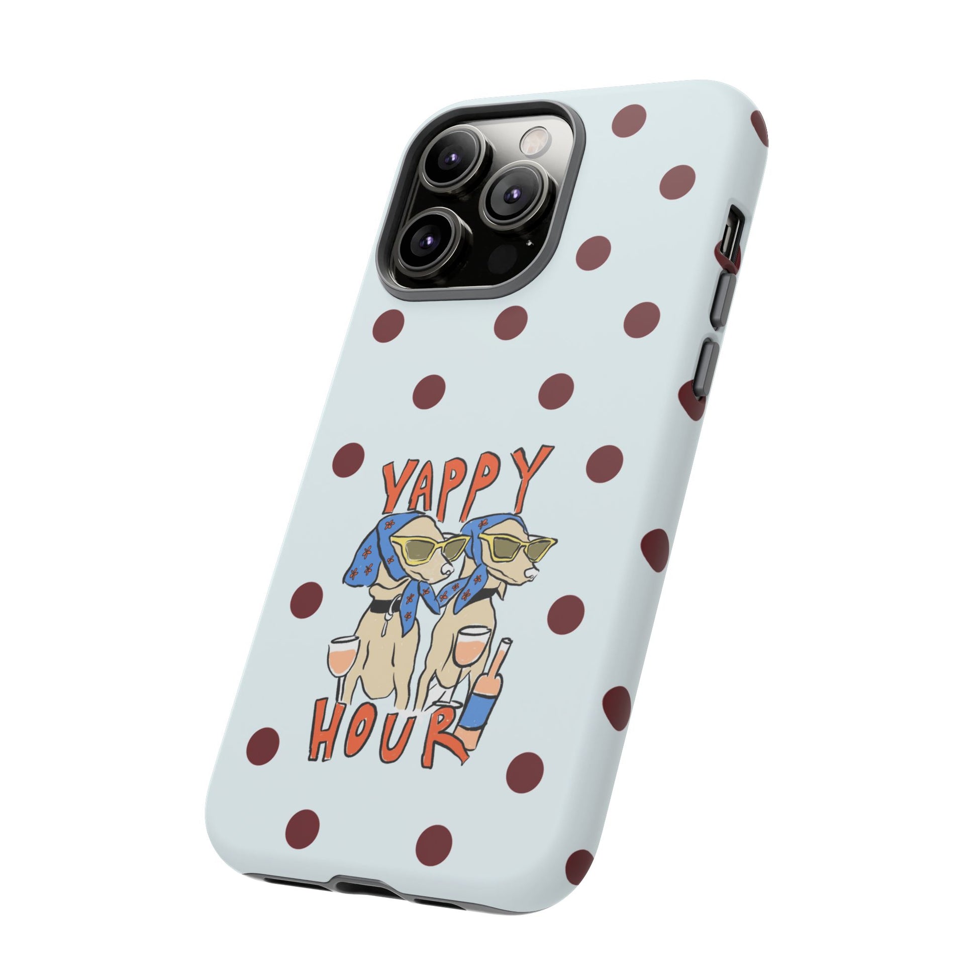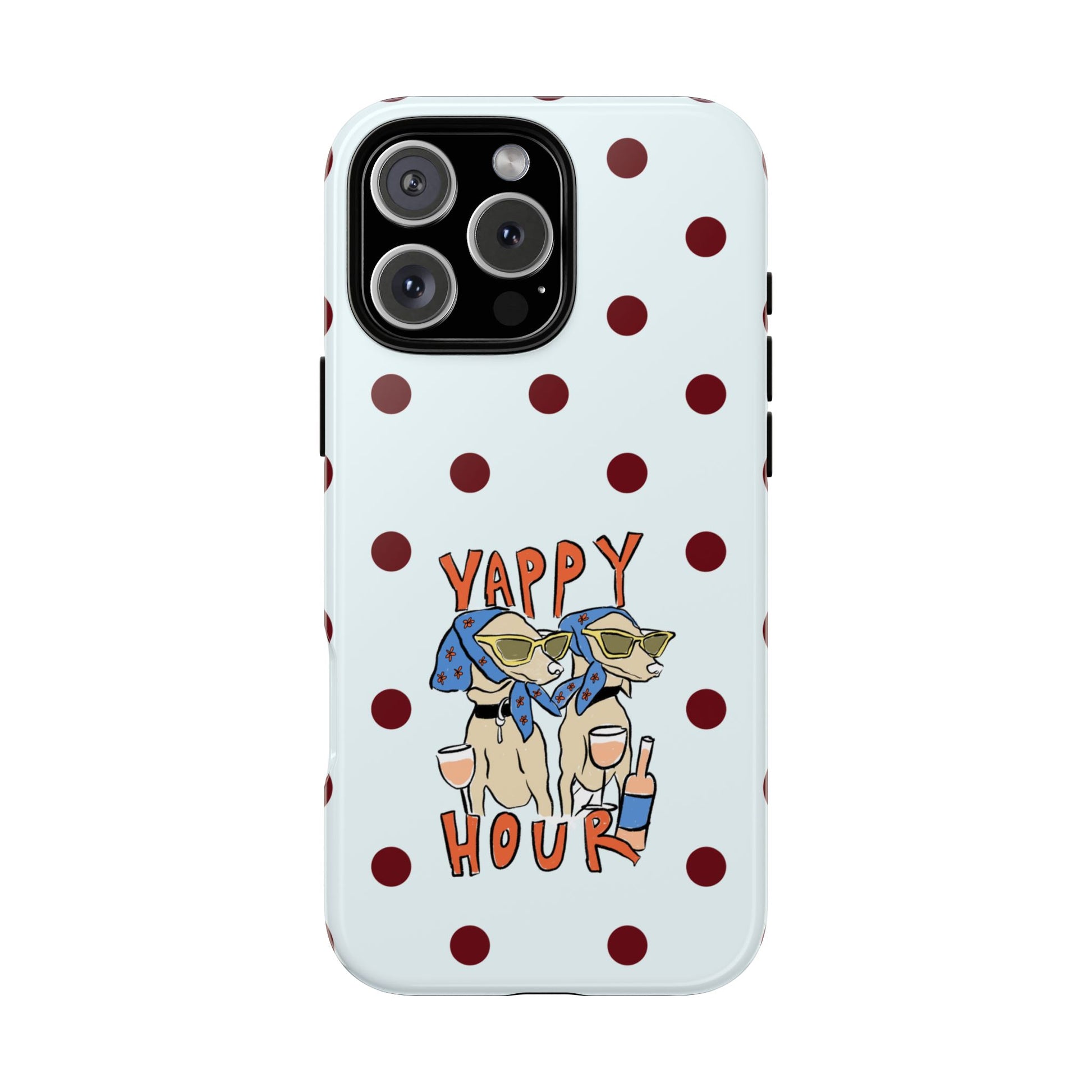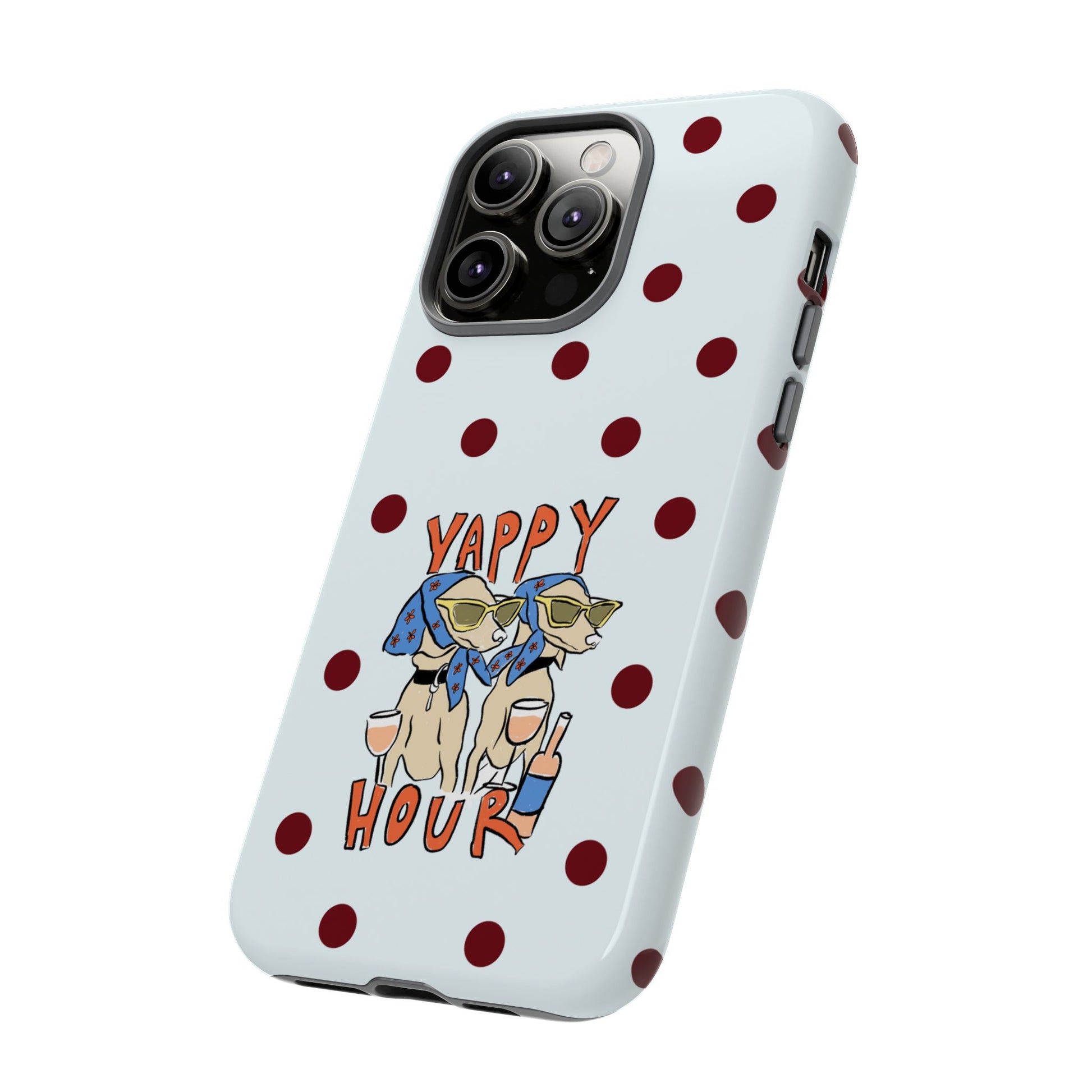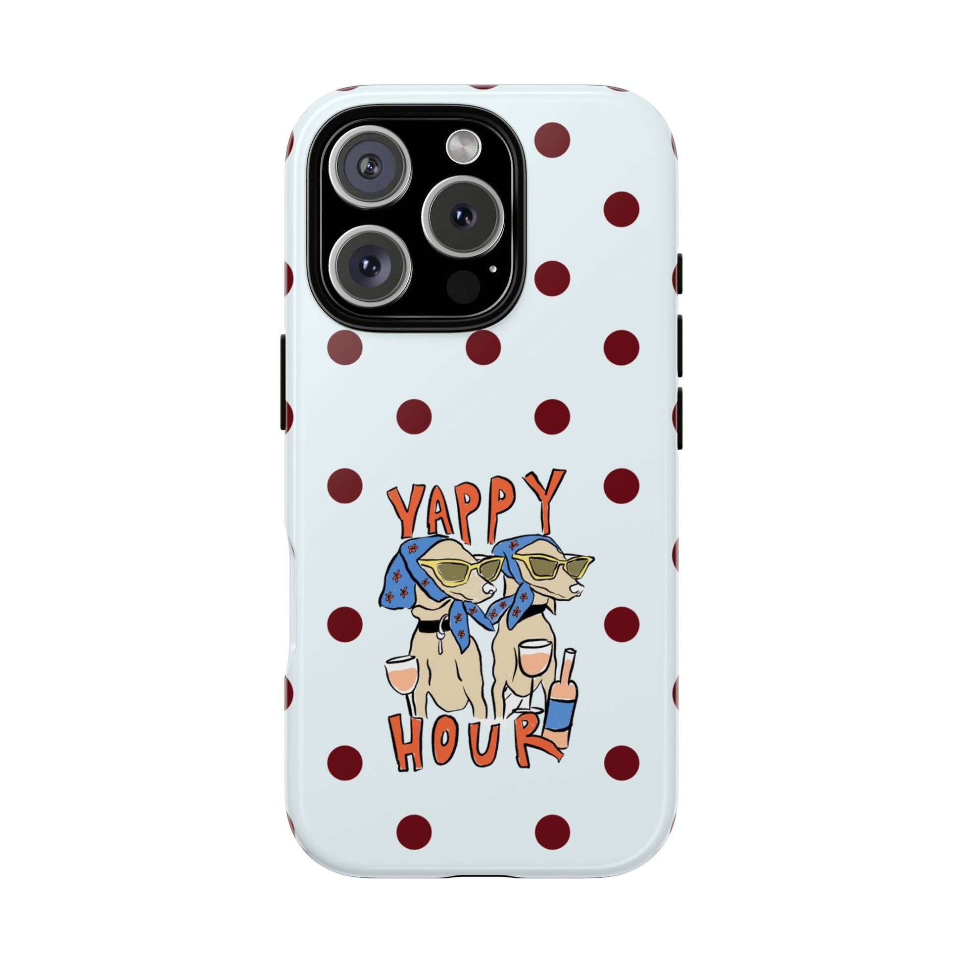 Laughing pups, clinking glasses, and playful polka dots—this phone case brings a little happy hour wherever you go. The illustration captures dogs lounging with wine glasses, barking gossip and cozy summer energy. For adults who love cheeky, whimsical designs and reliable protection, this case balances personality with punchy durability.