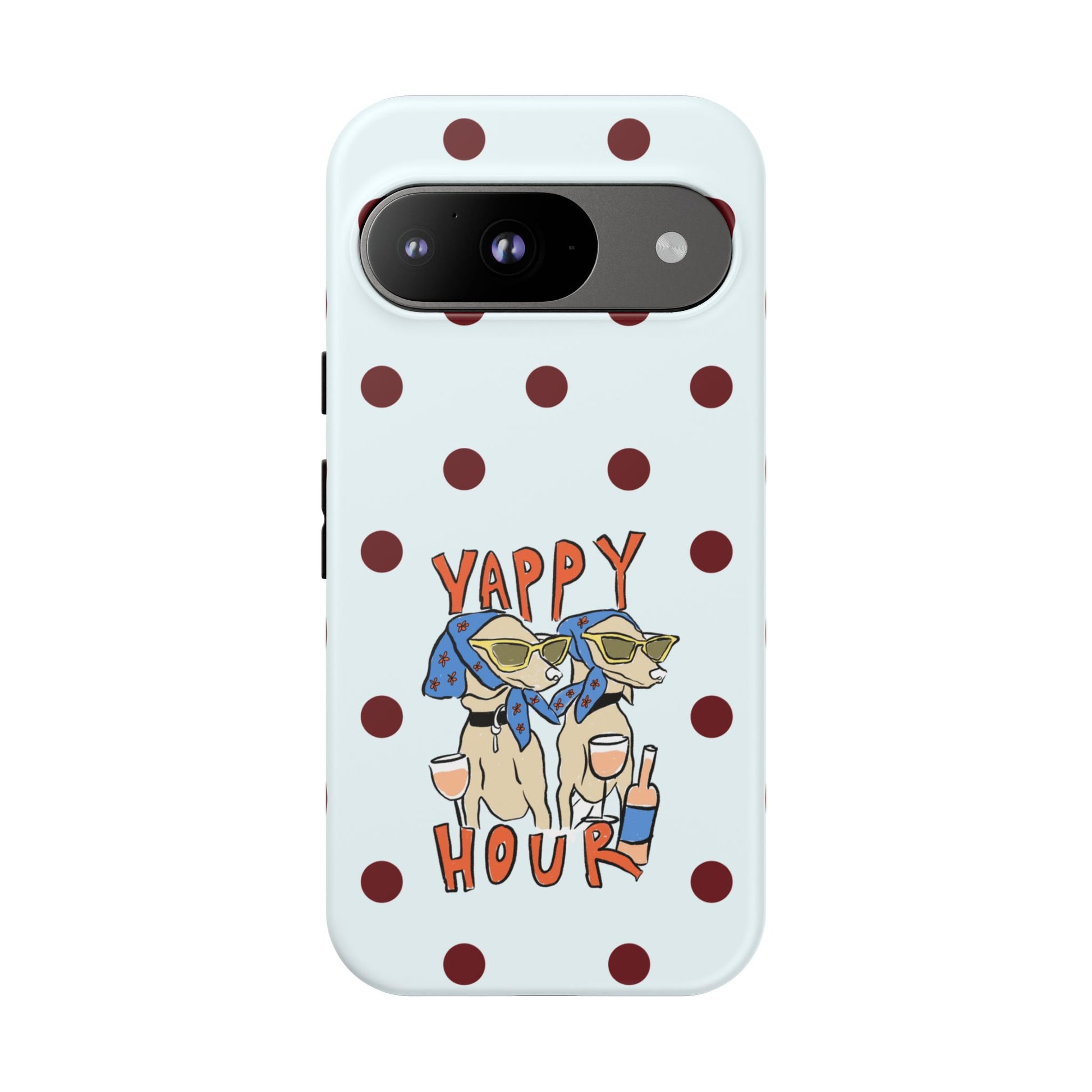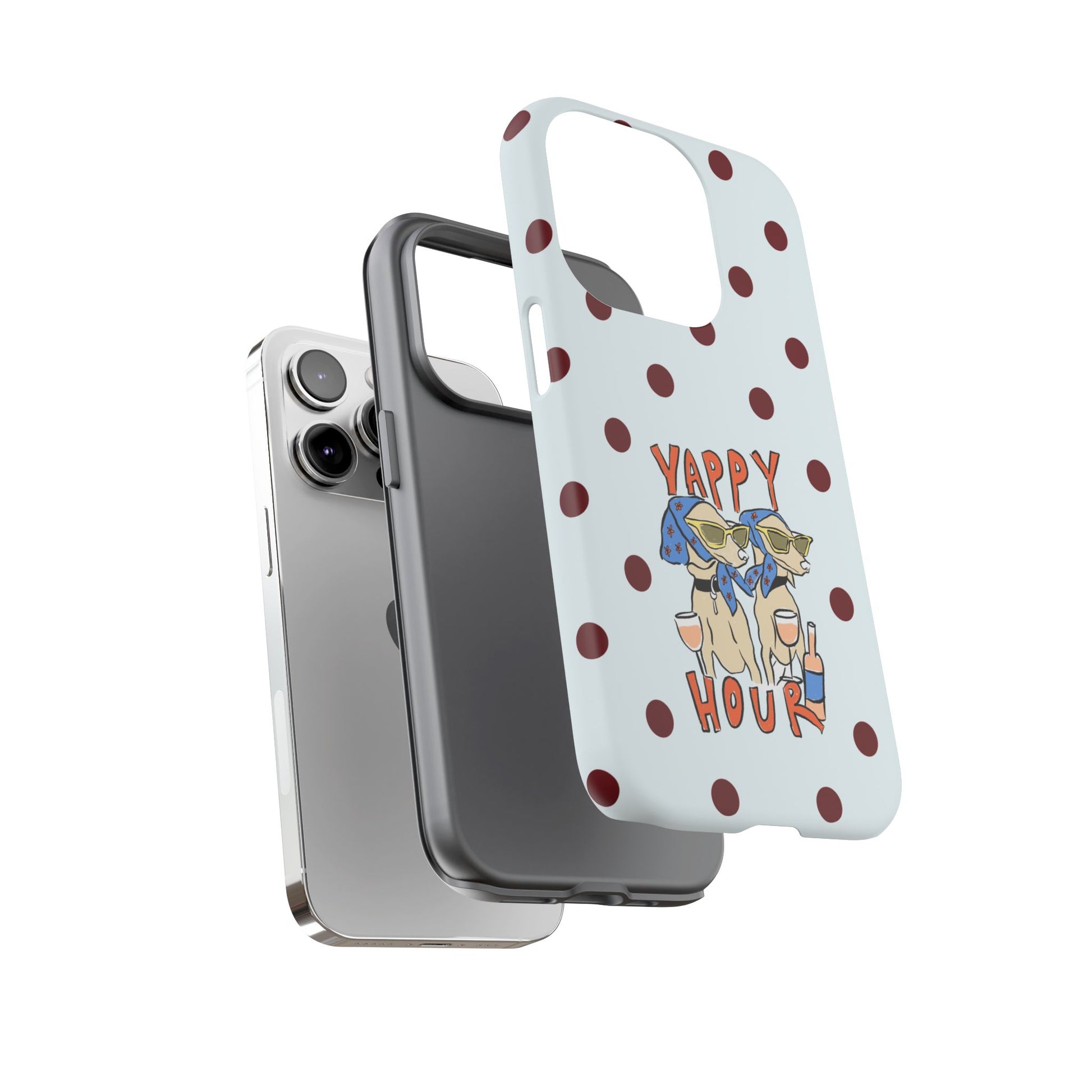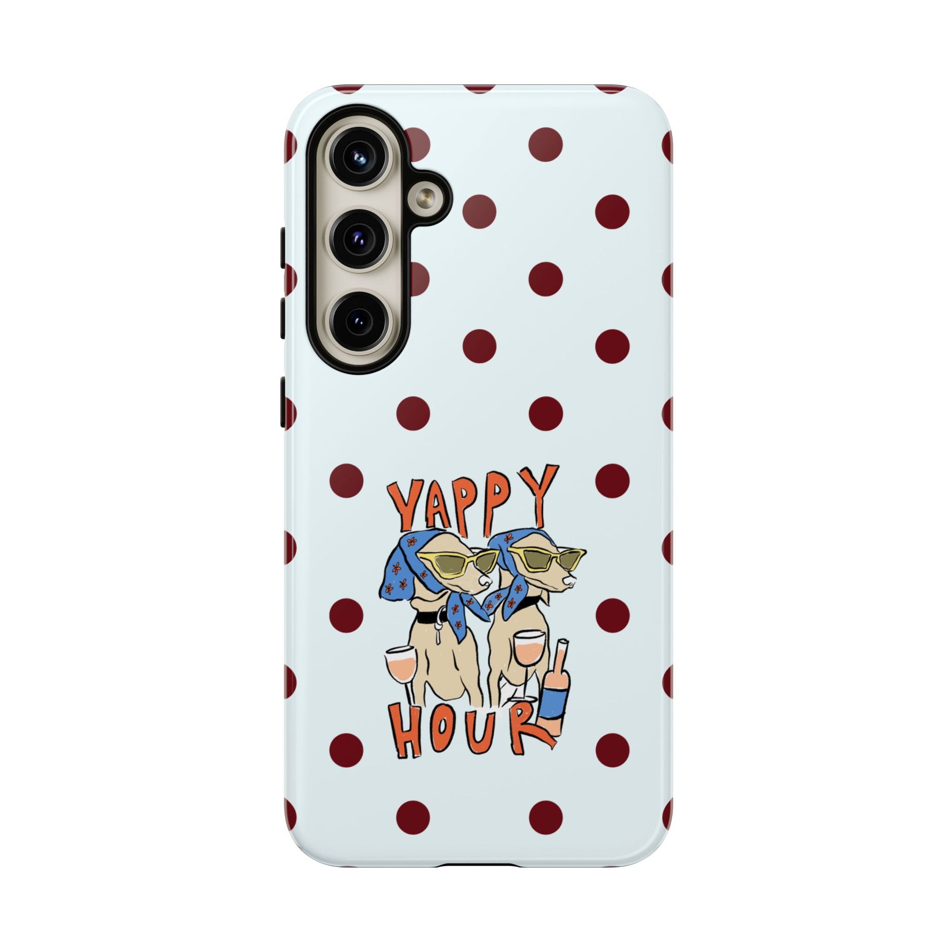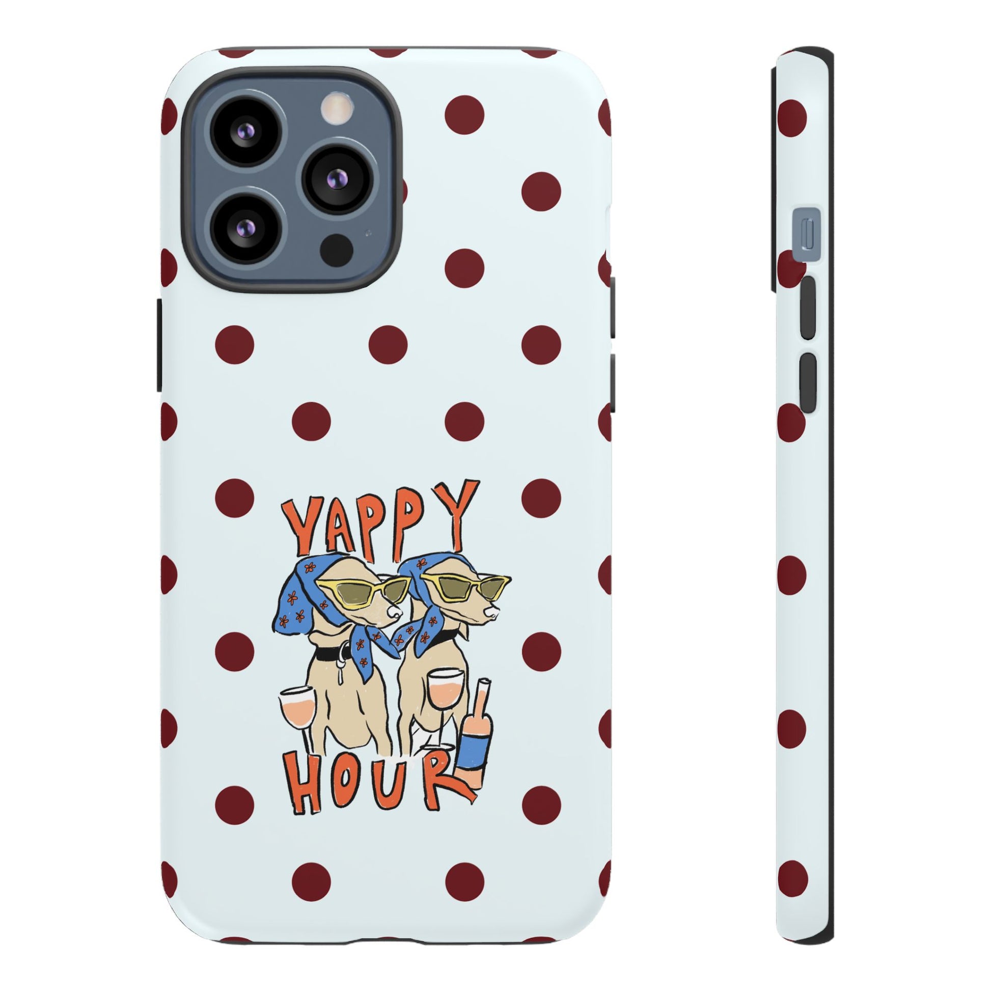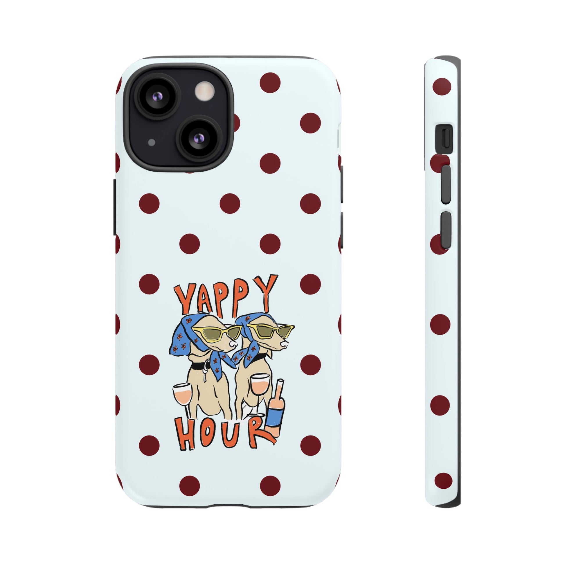 Laughing pups, clinking glasses, and playful polka dots—this phone case brings a little happy hour wherever you go. The illustration captures dogs lounging with wine glasses, barking gossip and cozy summer energy. For adults who love cheeky, whimsical designs and reliable protection, this case balances personality with punchy durability.