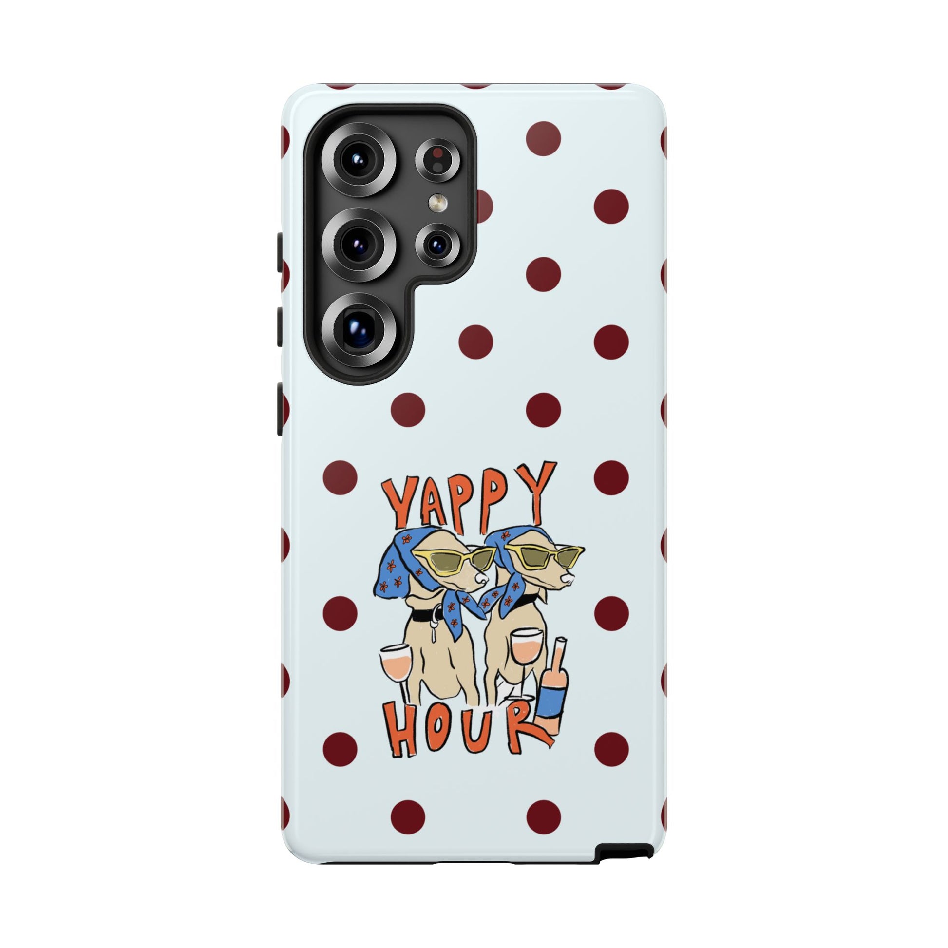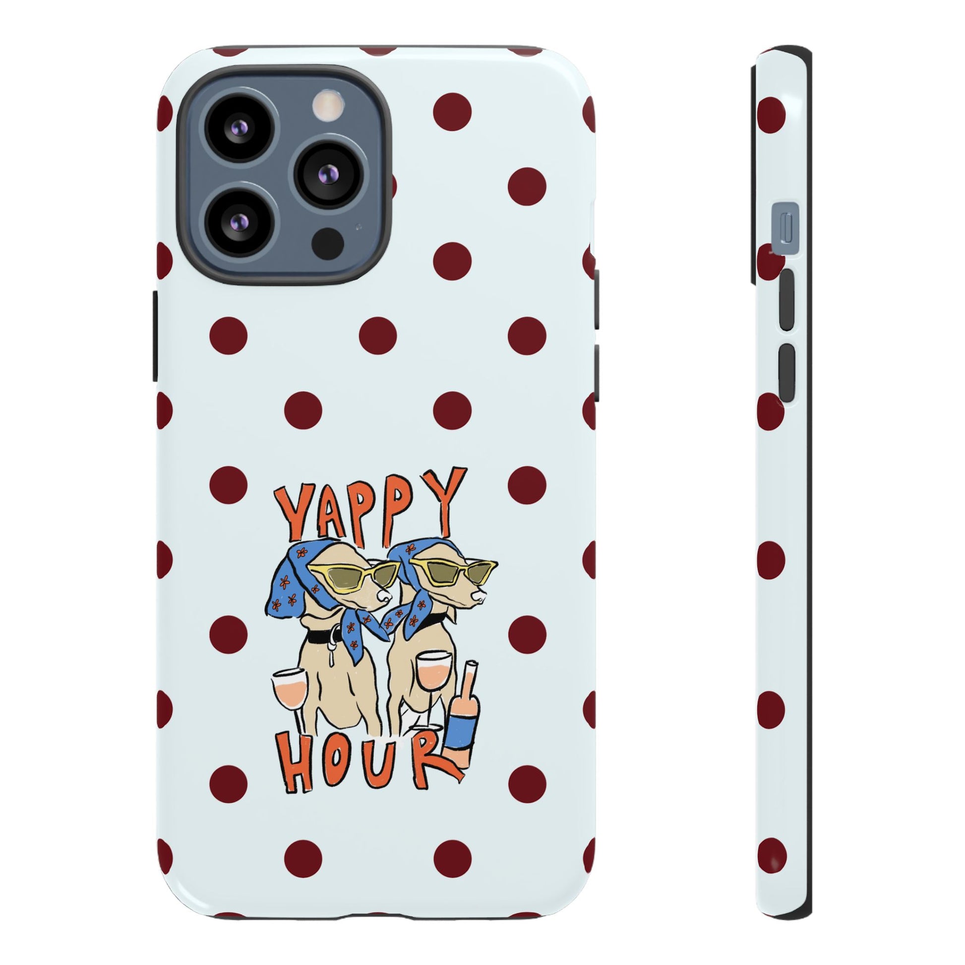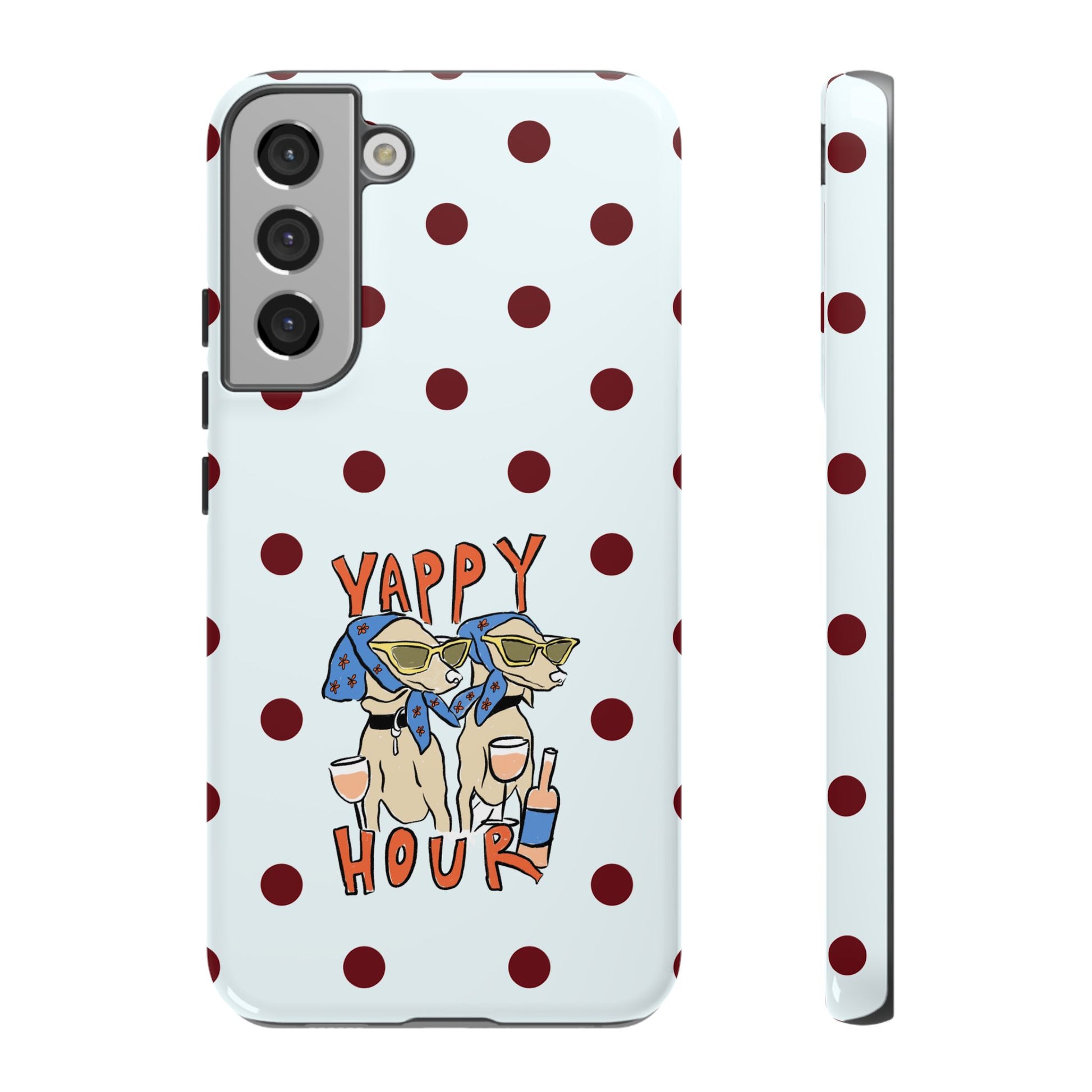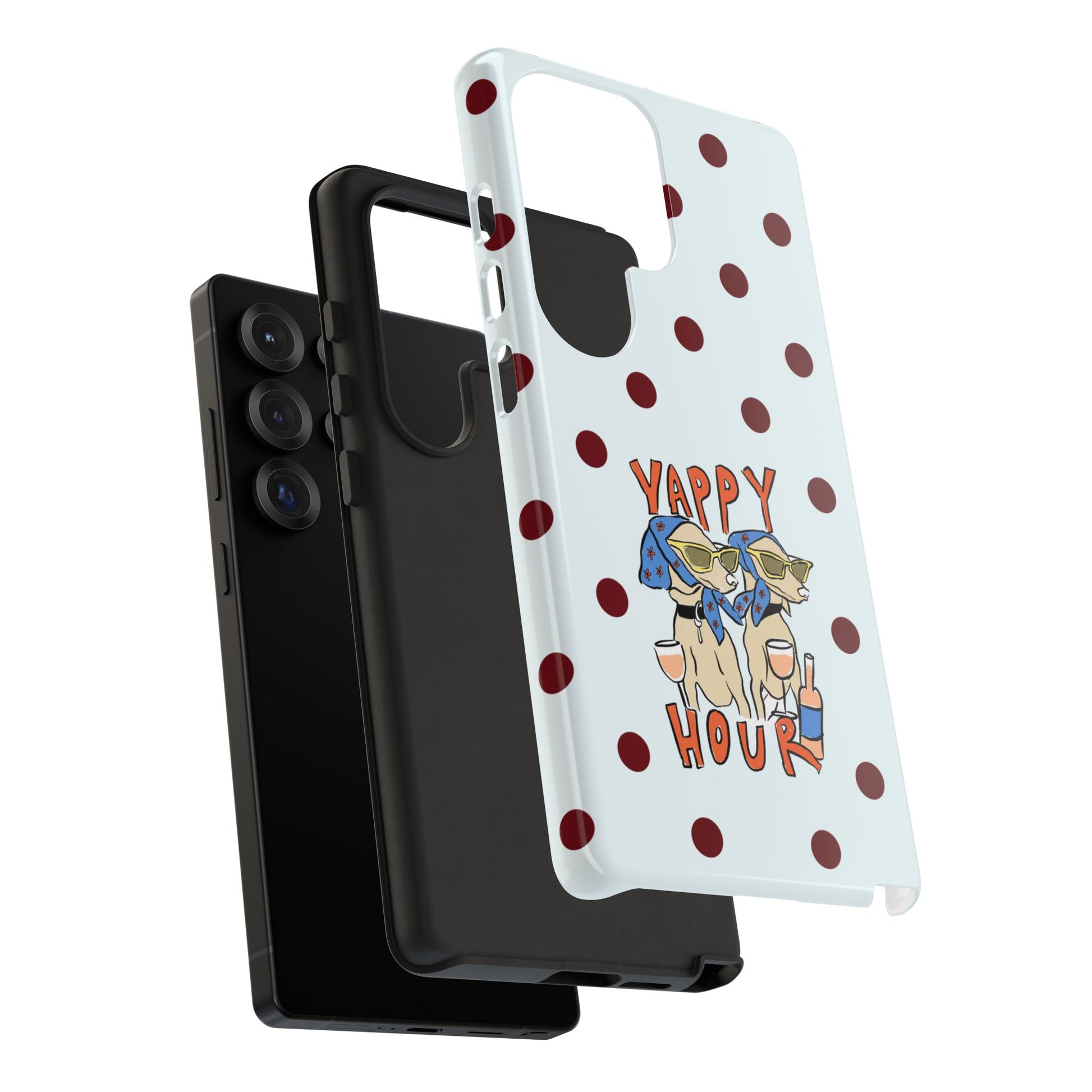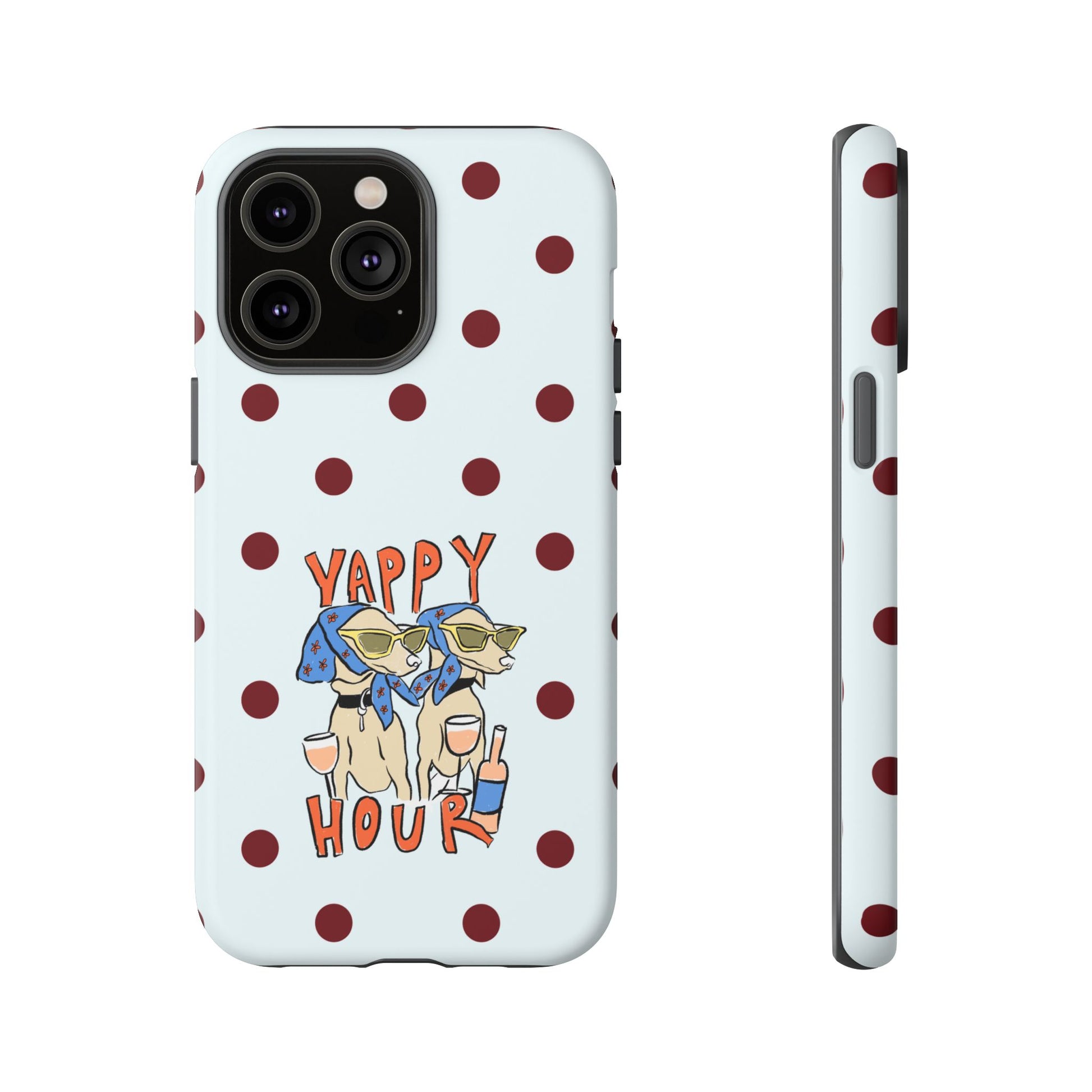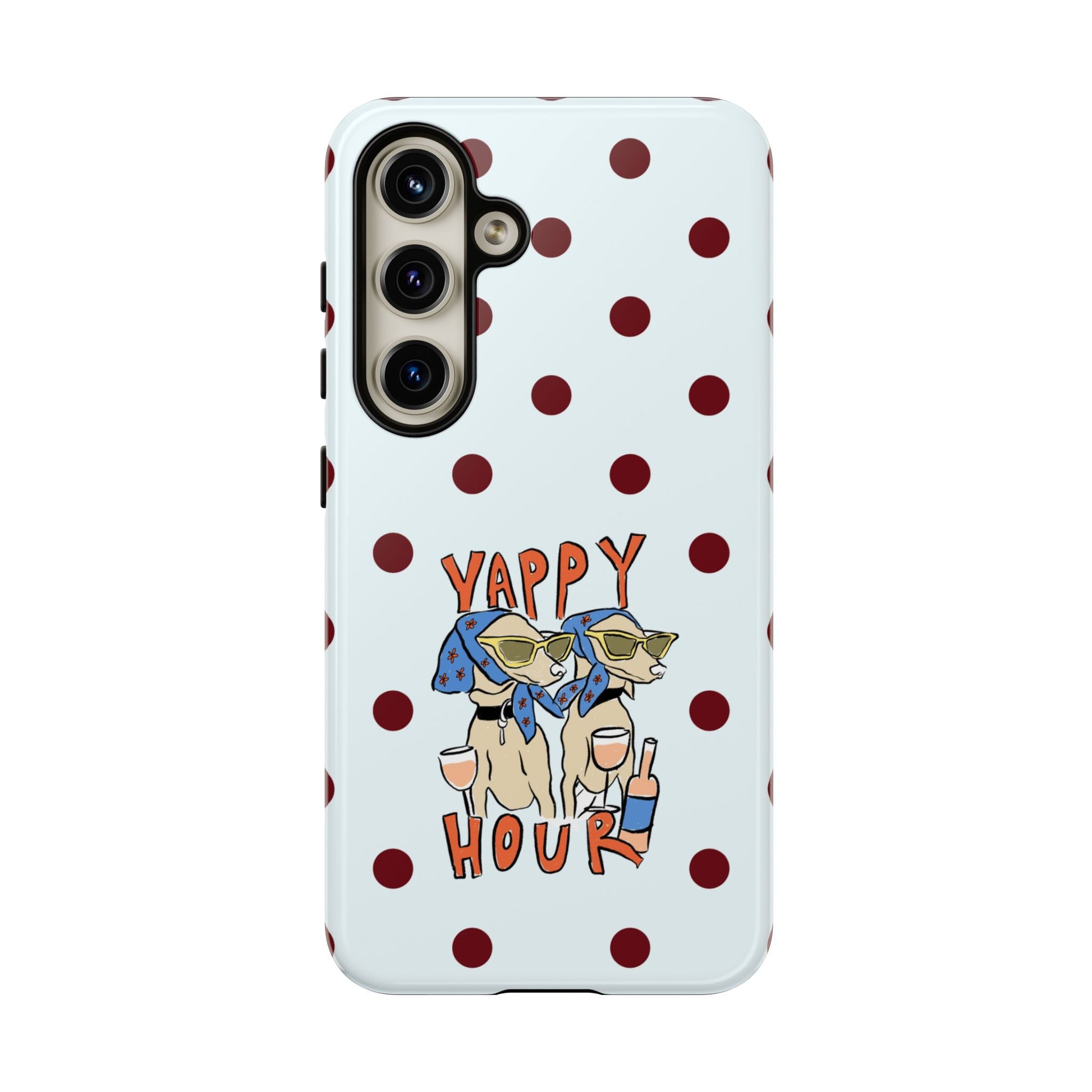 Laughing pups, clinking glasses, and playful polka dots—this phone case brings a little happy hour wherever you go. The illustration captures dogs lounging with wine glasses, barking gossip and cozy summer energy. For adults who love cheeky, whimsical designs and reliable protection, this case balances personality with punchy durability.