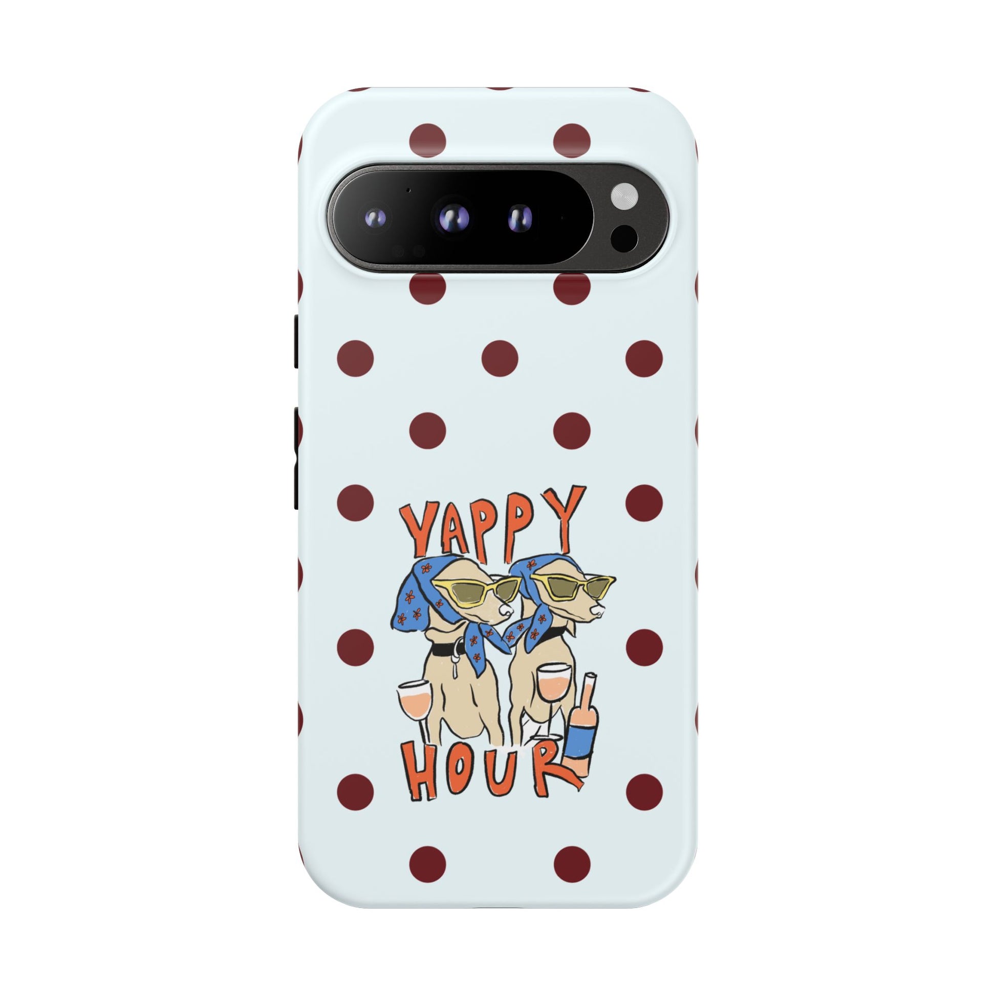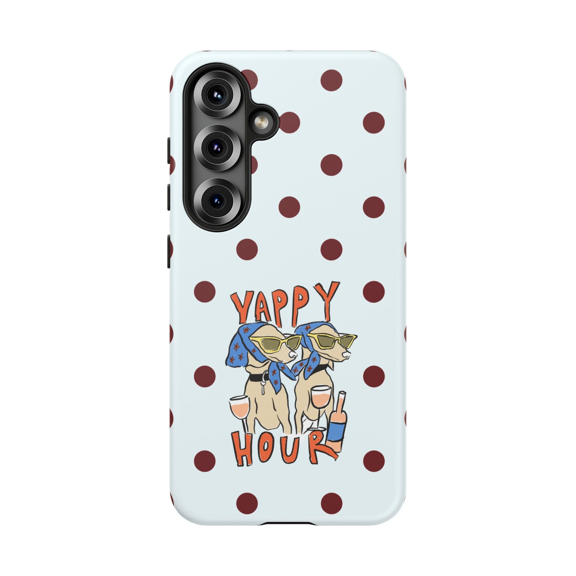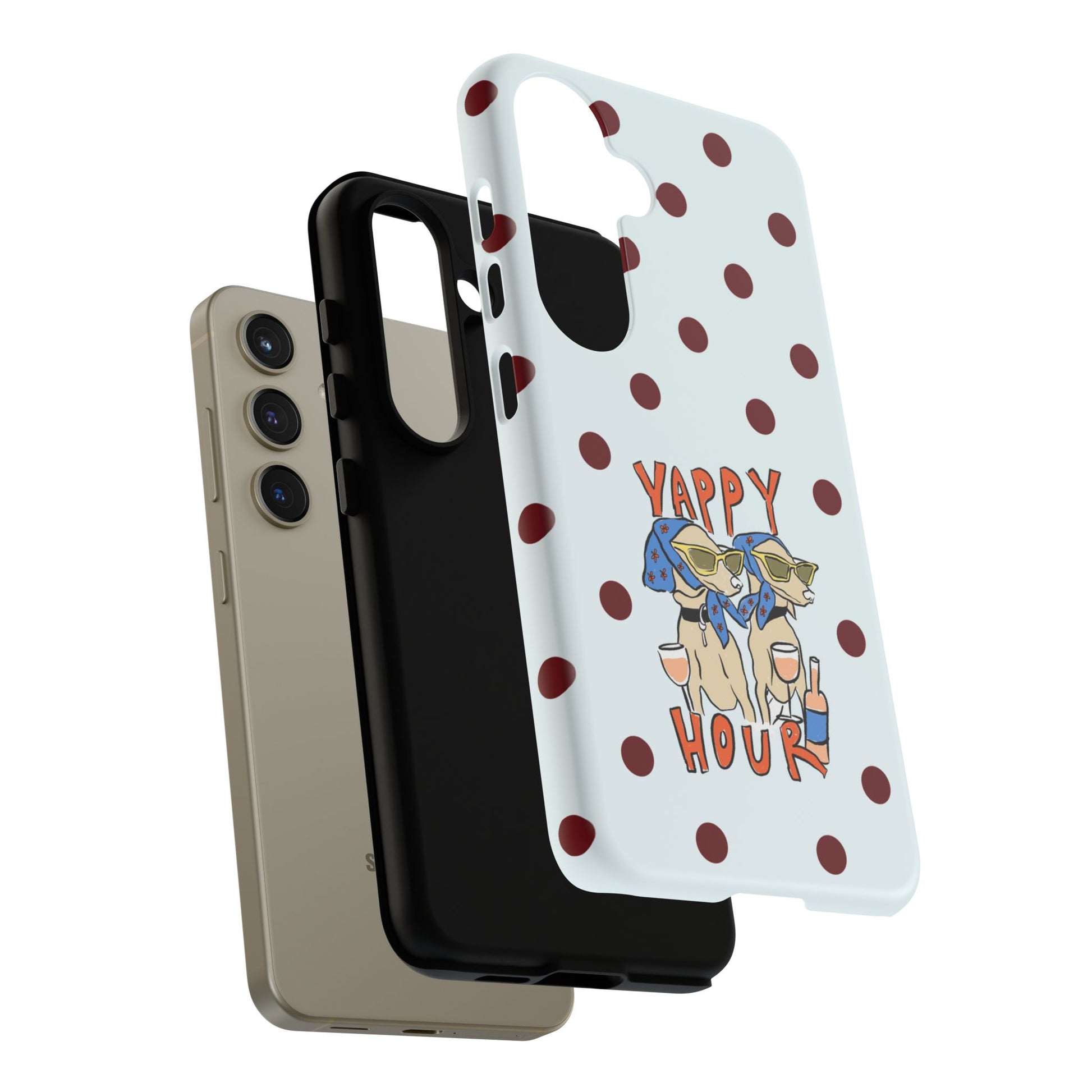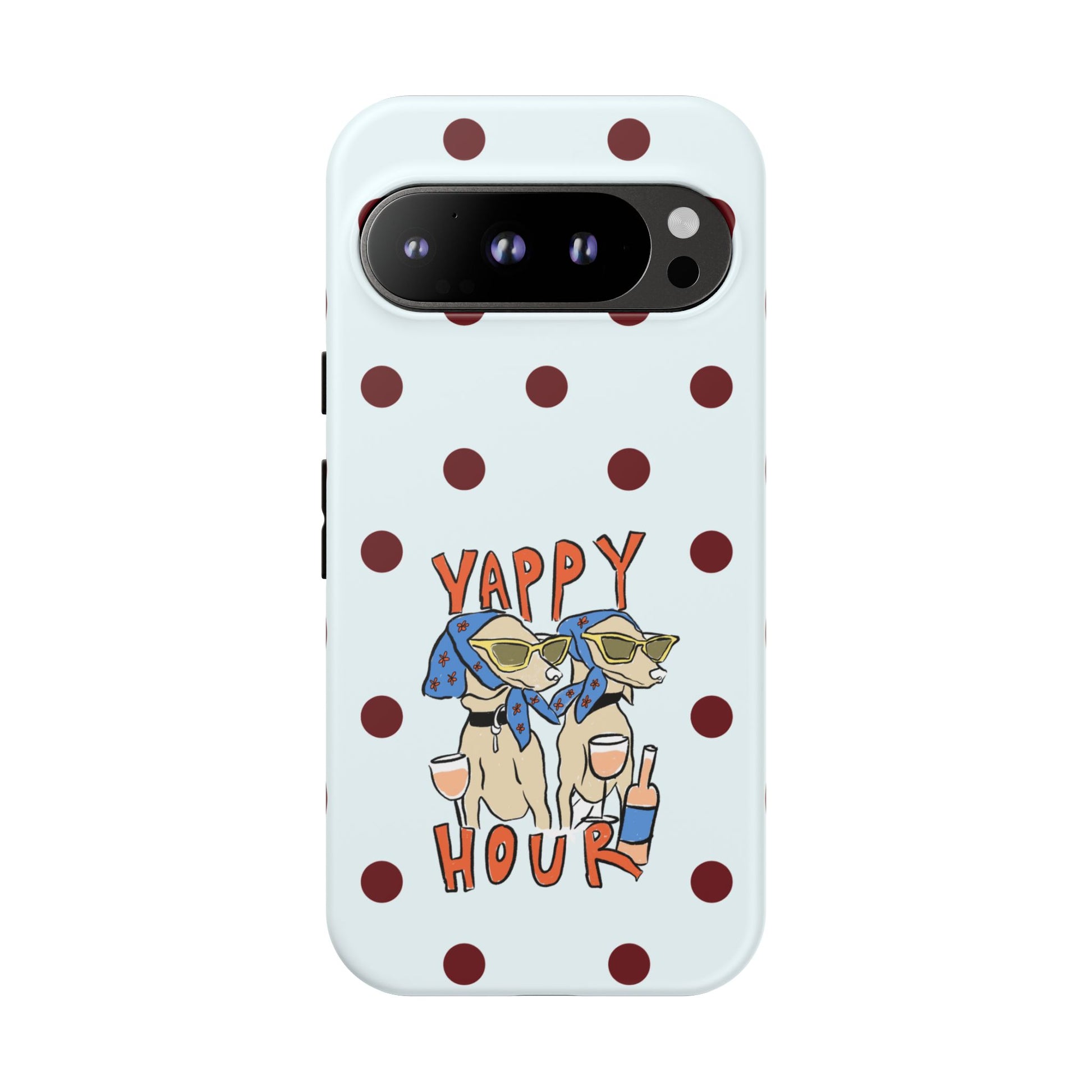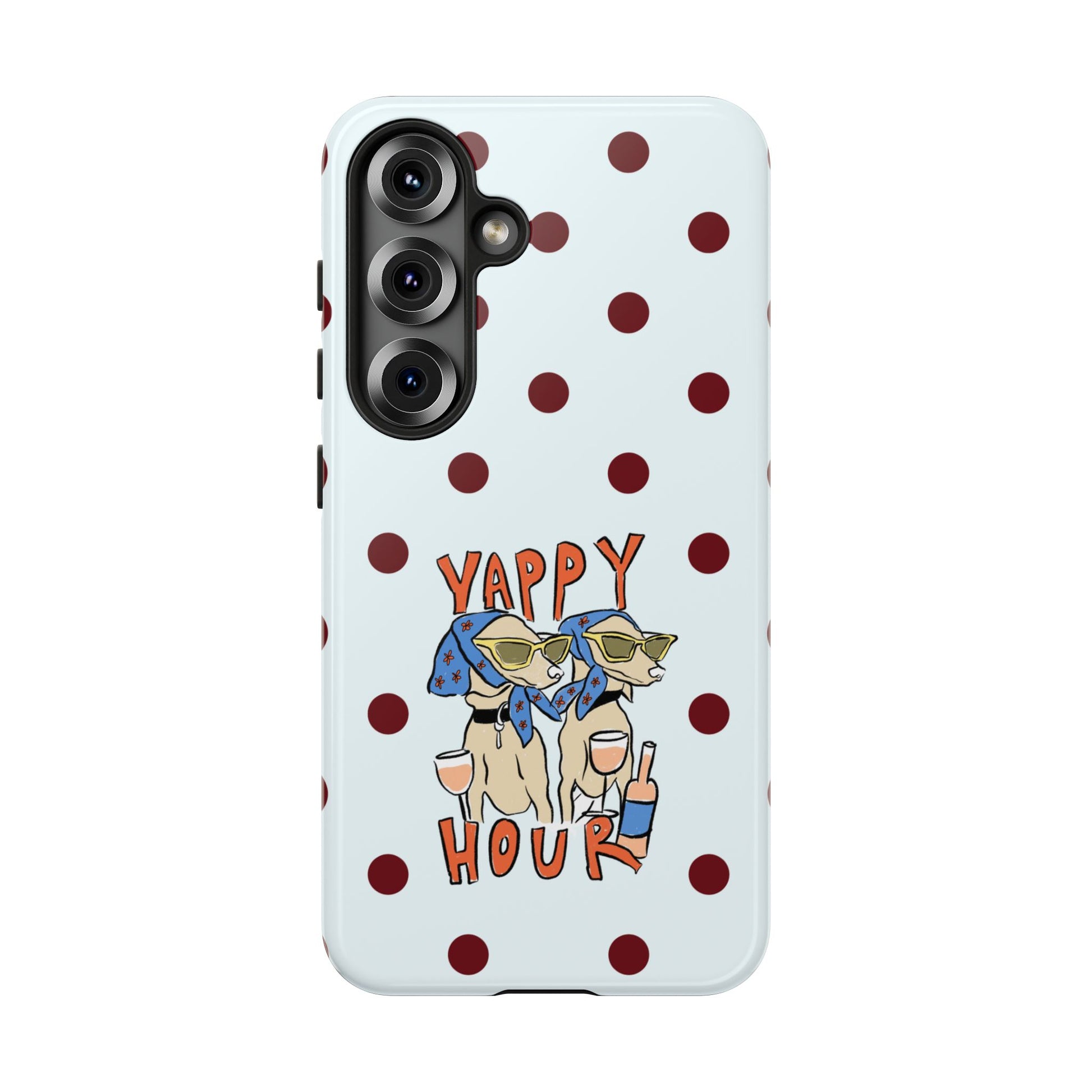 Laughing pups, clinking glasses, and playful polka dots—this phone case brings a little happy hour wherever you go. The illustration captures dogs lounging with wine glasses, barking gossip and cozy summer energy. For adults who love cheeky, whimsical designs and reliable protection, this case balances personality with punchy durability.