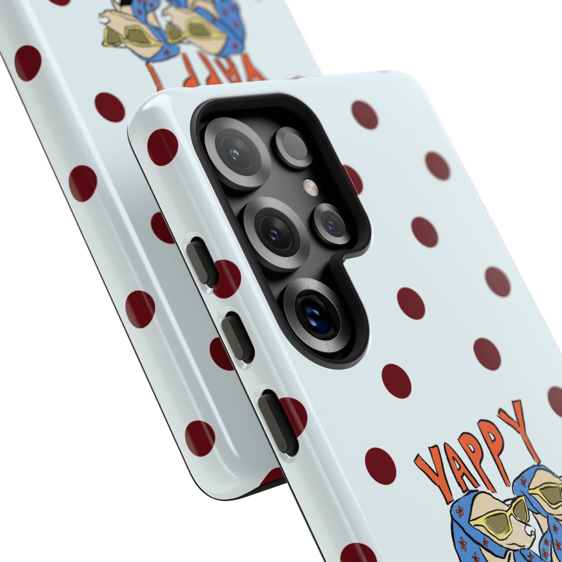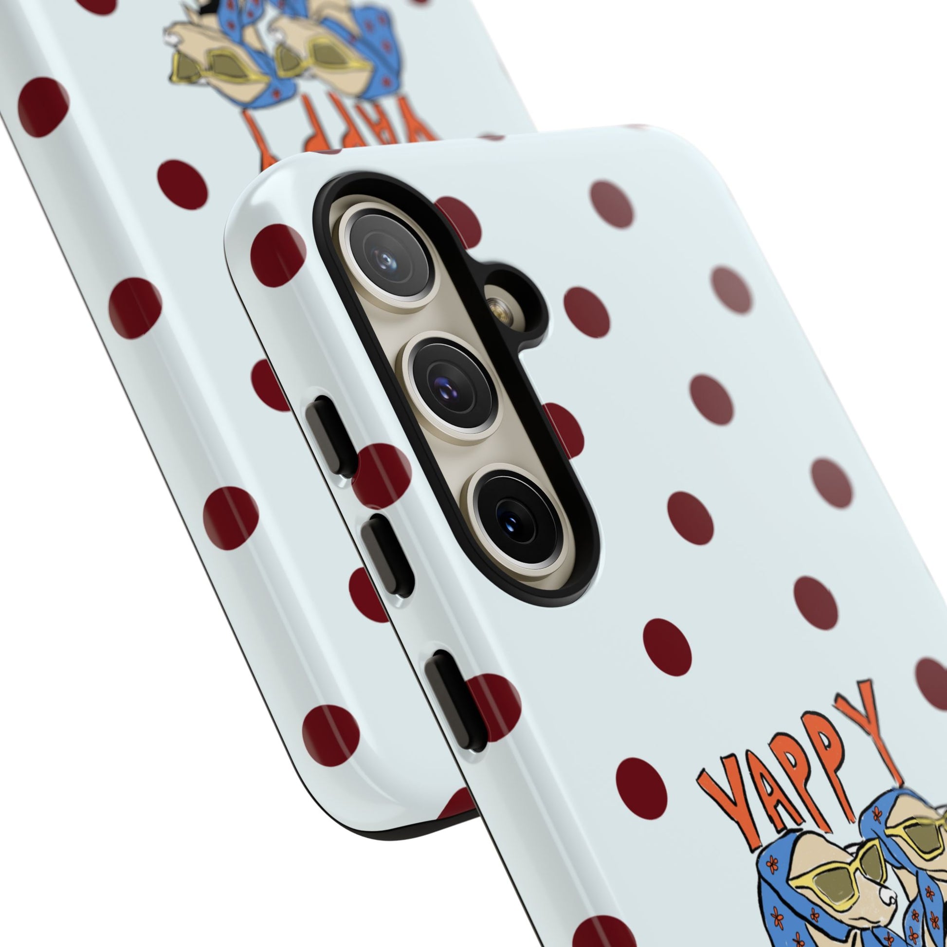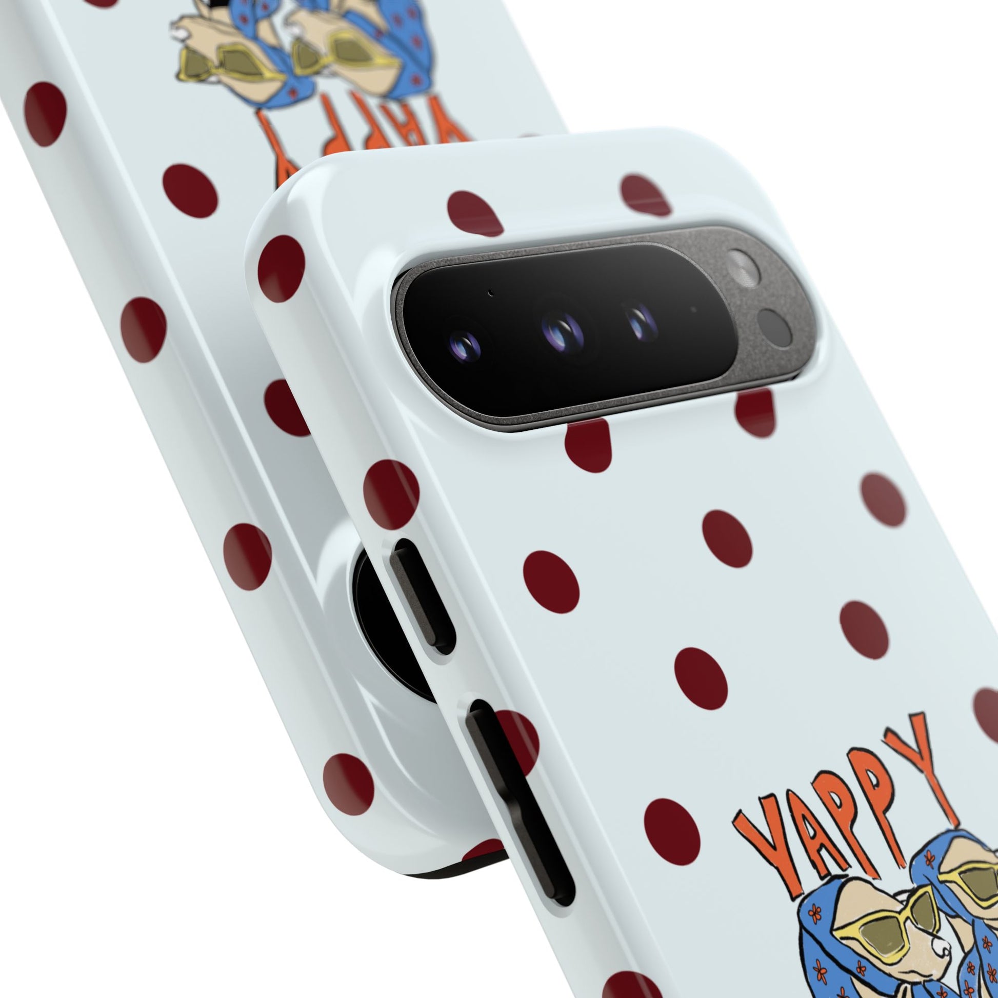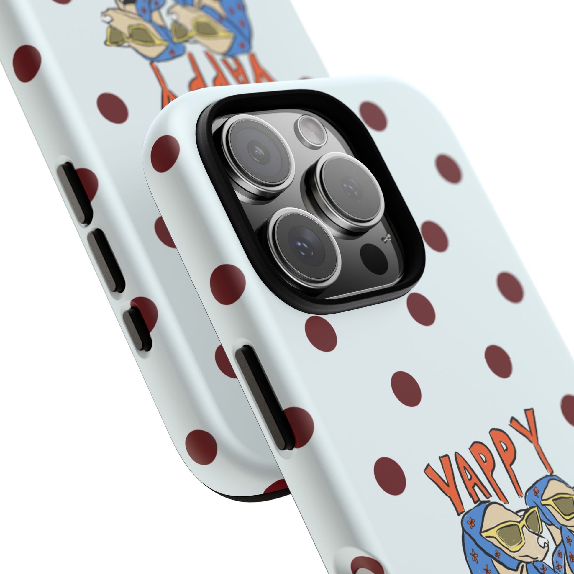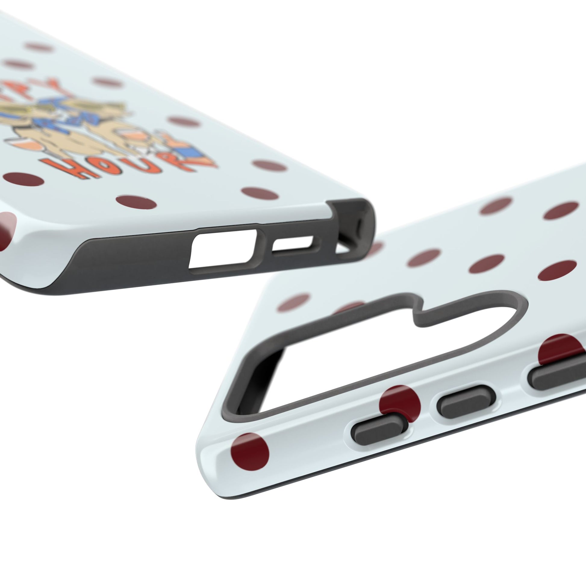 Laughing pups, clinking glasses, and playful polka dots—this phone case brings a little happy hour wherever you go. The illustration captures dogs lounging with wine glasses, barking gossip and cozy summer energy. For adults who love cheeky, whimsical designs and reliable protection, this case balances personality with punchy durability.